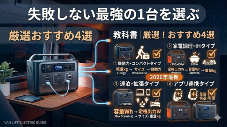【2026最新】車中泊用ポータブル電源おすすめ4選|タイプ別の失敗しない比較ガイド