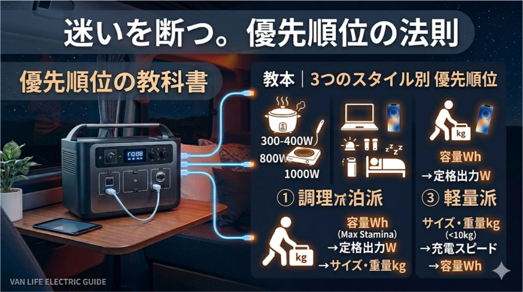 ポータブル電源選びは、「何かを優先し、何かを妥協する」作業です。