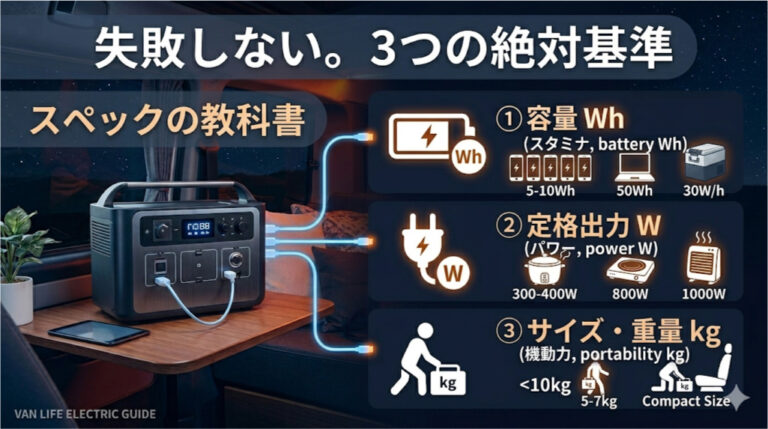 いざポータブル電源を調べ始めると、画面に並ぶのは「1000Wh」「定格出力1500W」「リン酸鉄」といった、聞き慣れない数字や専門用語の嵐。 「結局、どれを買えば私の車中泊は快適になるの?」と、ブラウザのタブをそっと閉じ … 続きを読む ポータブル電源選びで「大失敗」しないための教科書|優先順位の決め方