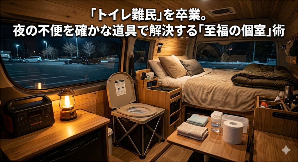 暗い駐車場を歩く防犯上の不安や、エンジンを切った瞬間に急降下を始める車内の気温。意を決してドアを開けた瞬間の冷気に身をすくめ、ようやく辿り着いたトイレは大混雑……。これでは、せっかくのリラックスタイムも台無しです。「車内にトイレがある」という安心感は、単なる便利さを超え、あなたの夜を「完全なプライベートシェルター」へと変える最後のピースとなります。
