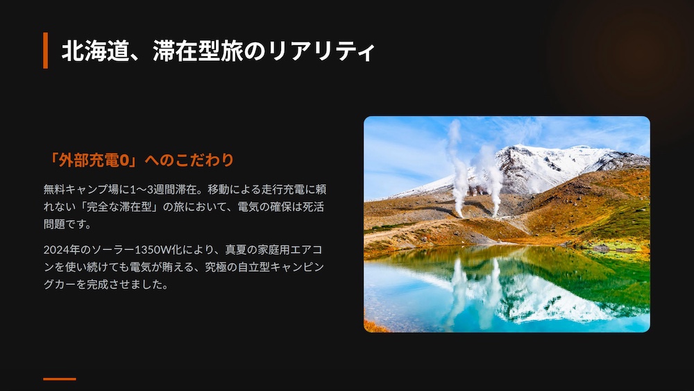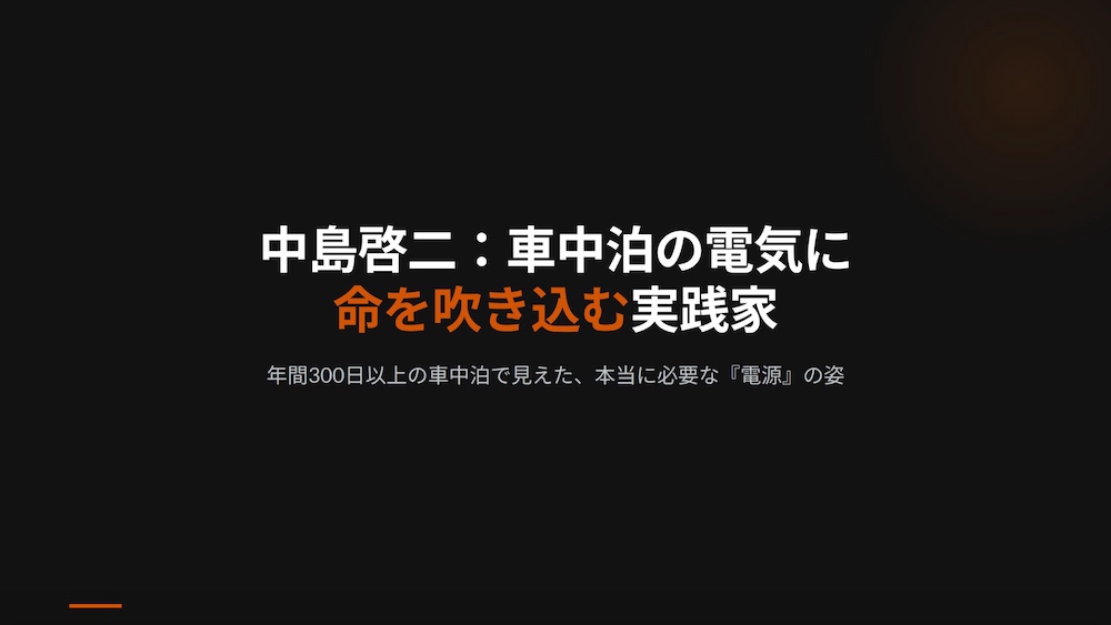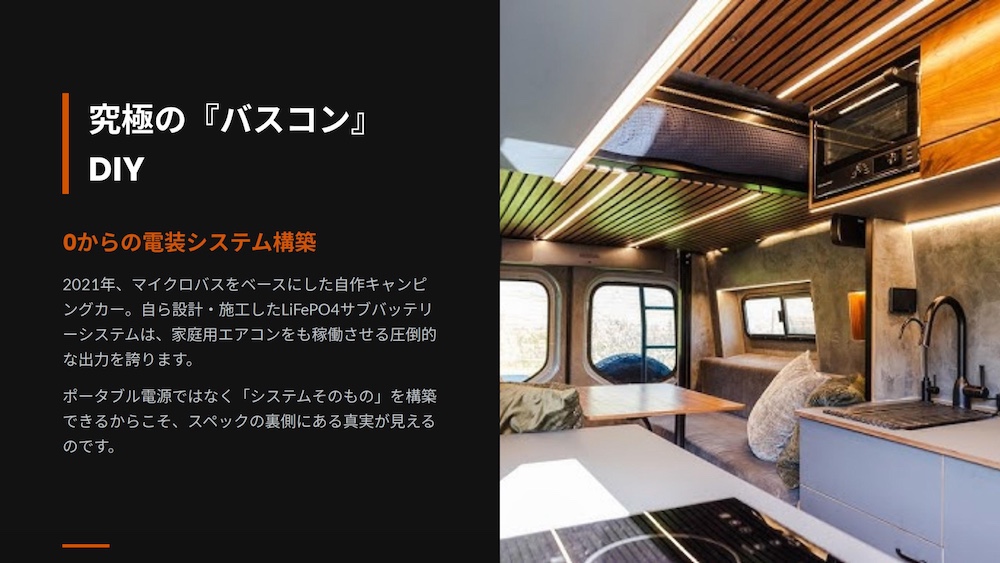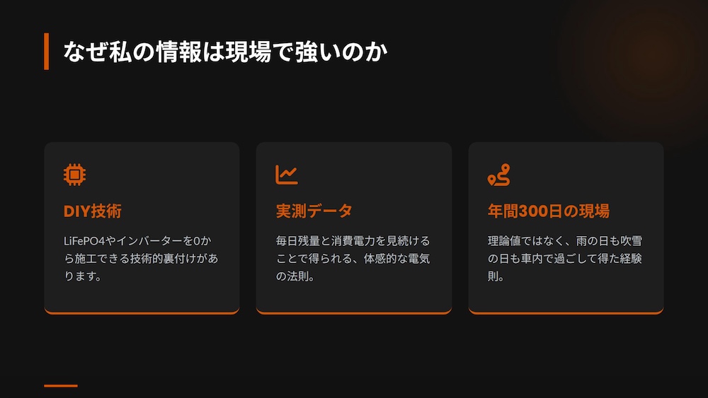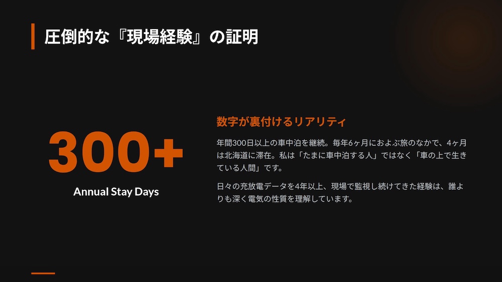 年間300日以上を車内で過ごし、毎日バッテリーの残量と消費電力の動きを観察し続けているからこそ、理論値ではない「現場のリアルな電気の法則」が体に染み付いています。