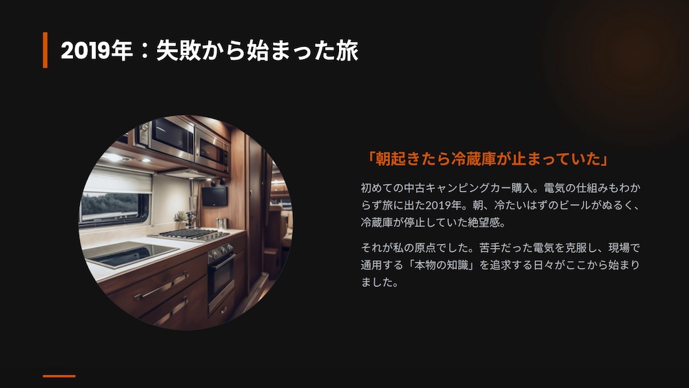 「エンジンを切ったら、冷蔵庫の中身はどうなるんだろう?」「照明をつけっぱなしで寝ても大丈夫?」 そんな初歩的な不安で頭がいっぱいでした。
