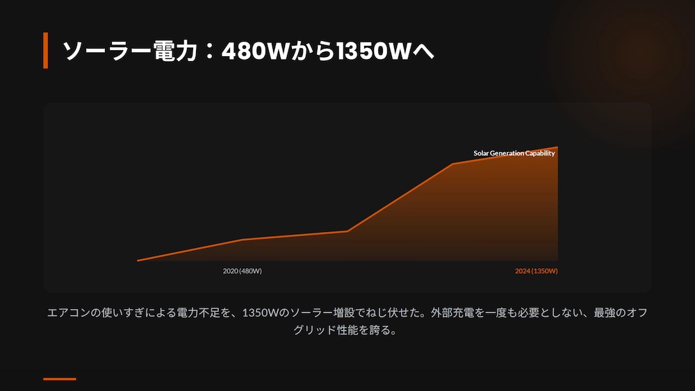 今では、1350Wのソーラーパネルを積み、夏場に家庭用エアコンをガンガン回しても、一度も外部充電をすることなく旅を続けられる「完全オフグリッド」な環境を実現しています。