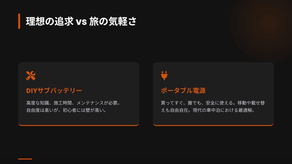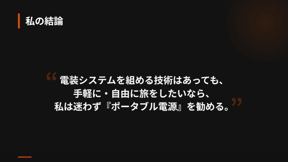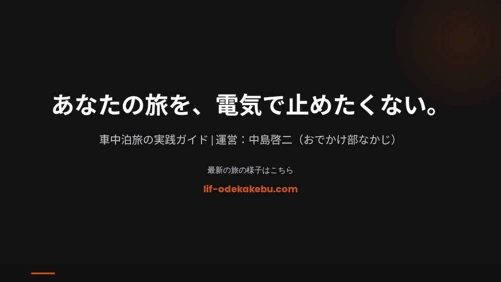 その答えはシンプルです。「旅の目的は、電気の管理ではなく、旅そのものを楽しむことだから」です。