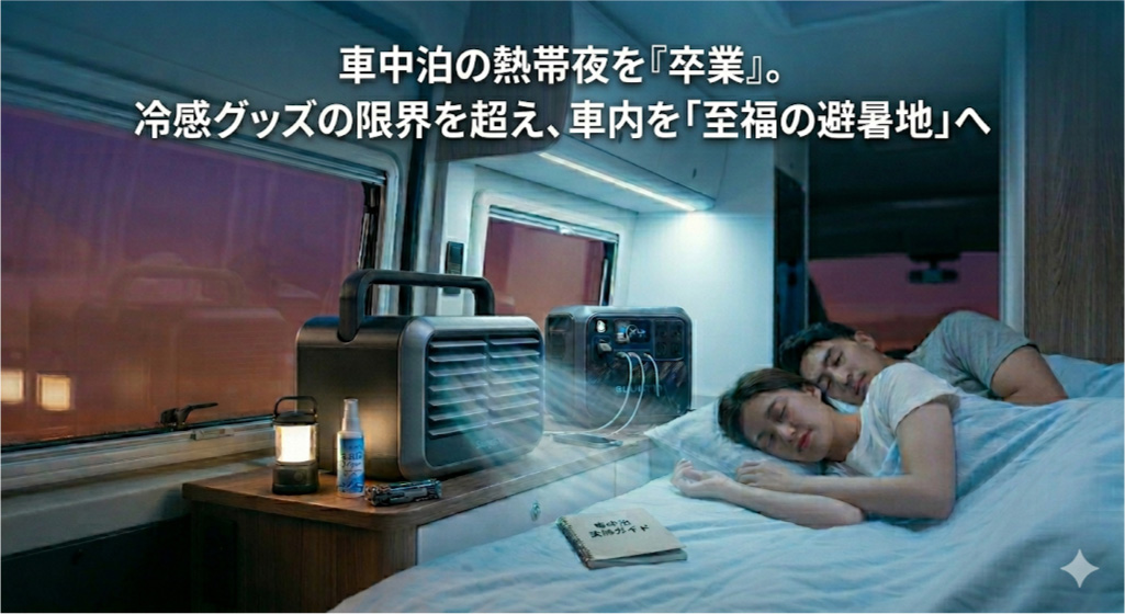 真夏の車中泊。エンジンを切った瞬間に忍び寄る「ムッ」とした熱気と、肌にまとわりつく湿気。 「標高が高いから大丈夫だろう」と高を括り、気休めの冷感シーツに横たわってみるものの、数分もすればシーツは体温でぬるくなり、寝返りを打つ場所もなくなります。慌てて冷風扇のスイッチを入れても、吹き出すのは湿り気を帯びた「ぬるい風」だけ。